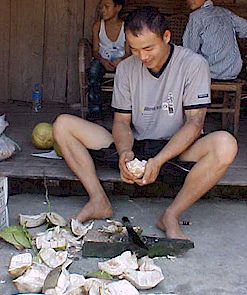 Before we continue on our way to the temple, since you are special guests, Nu Long's father is preparing a refreshing treat -- fresh coconut and grapefruit. Enjoy!